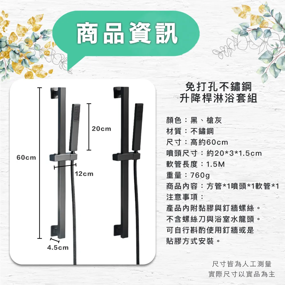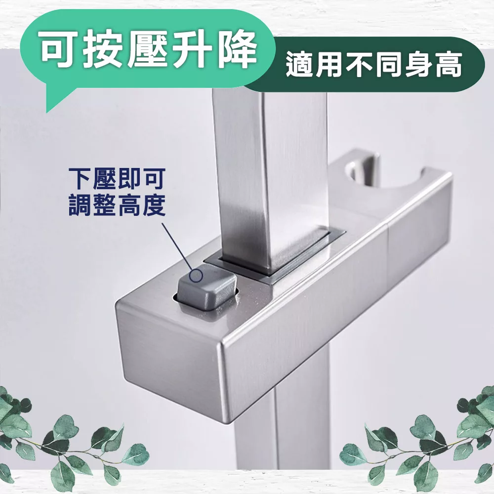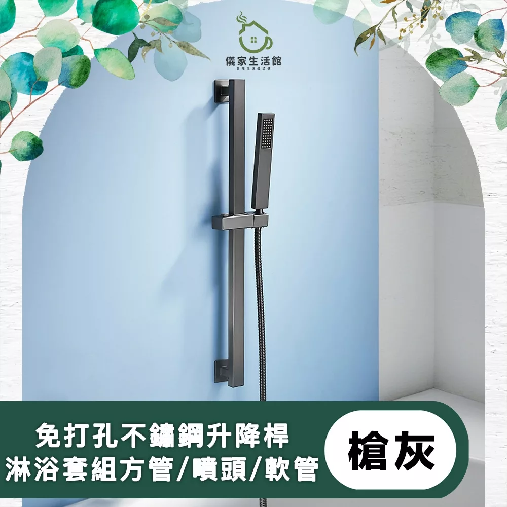 【儀家生活館】免打孔不鏽鋼升降桿淋浴套組 方管/噴頭/軟管
