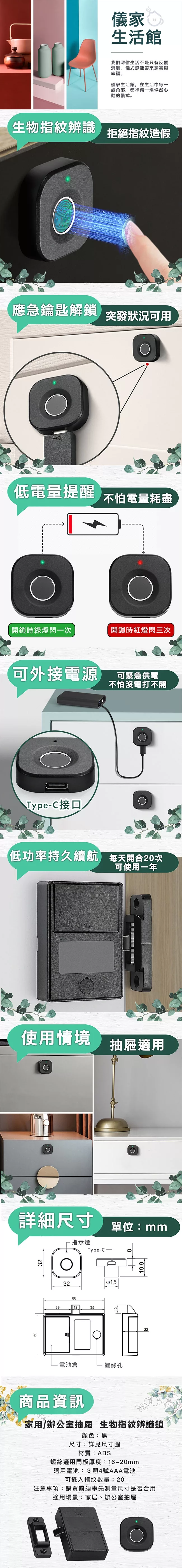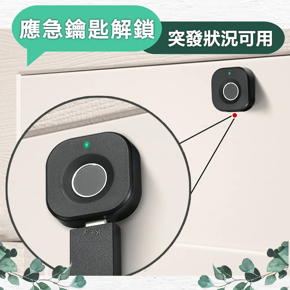 生物指紋辨識,拒絕指紋造假 緊急狀況可使用應急鑰匙解鎖 低電量提醒,不怕電量耗盡