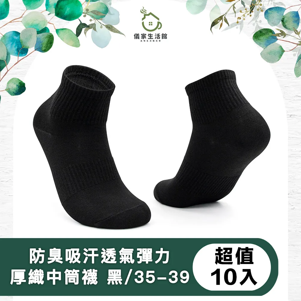 【儀家生活館】防臭吸汗透氣彈力厚織棉中筒襪 黑/35-39(超值10入)