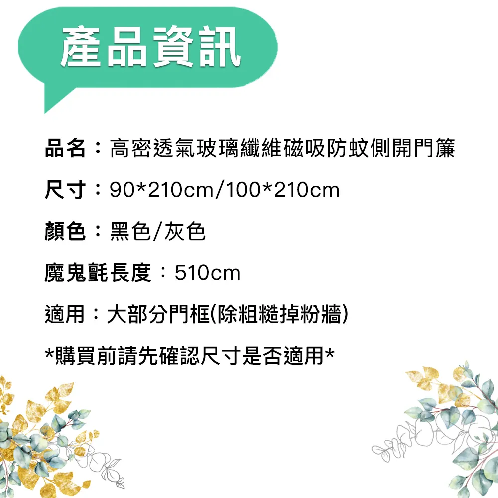 【儀家生活館】高密透氣玻璃纖維磁吸防蚊側開門簾(100x210cm) 數量