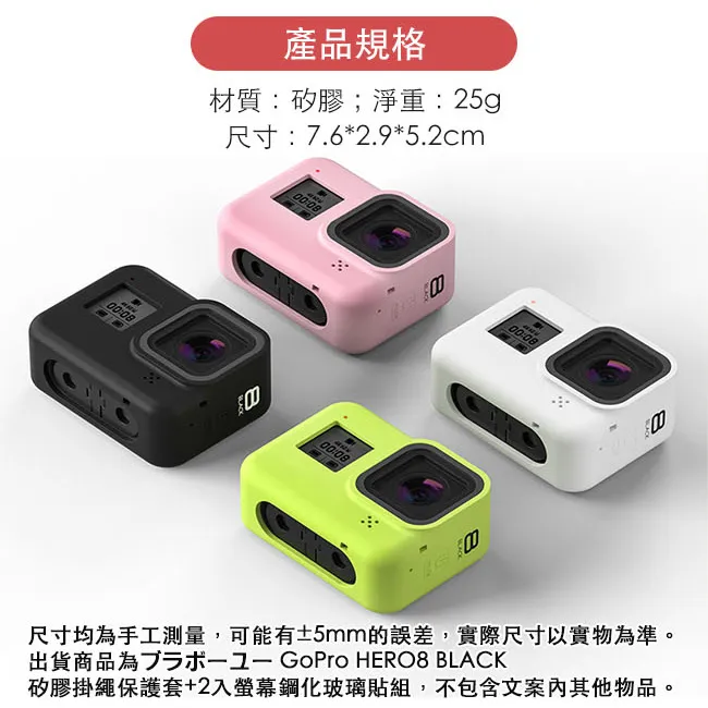 【嚴選】GoPro HERO8 BLACK 矽膠掛繩保護套+2入螢幕鋼化玻璃貼組