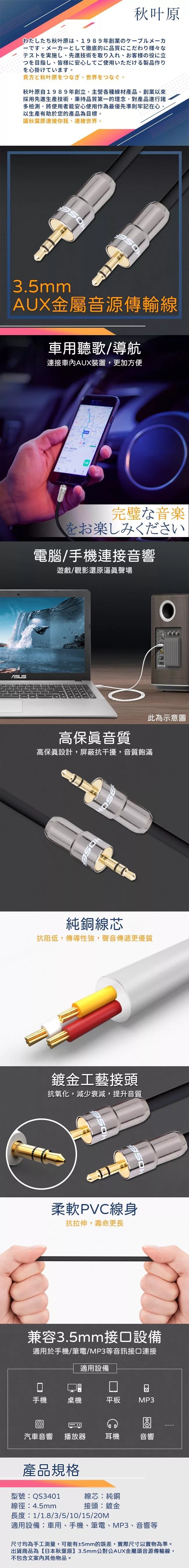 / 【日本秋葉原】3.5mm公對公AUX金屬頭音源傳輸線 1M