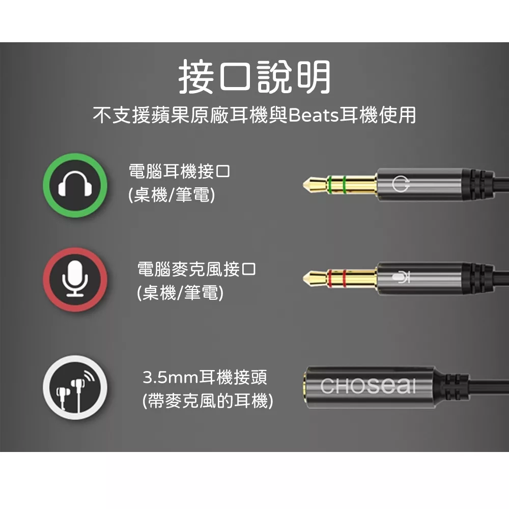 耳機+麥克風二合一轉接 精選銅線芯,聲音逼真還原 鍍金接頭抗氧化,提高傳輸穩定度 接頭尾部加固防護設計,耐彎折 PVC線身,耐拉伸