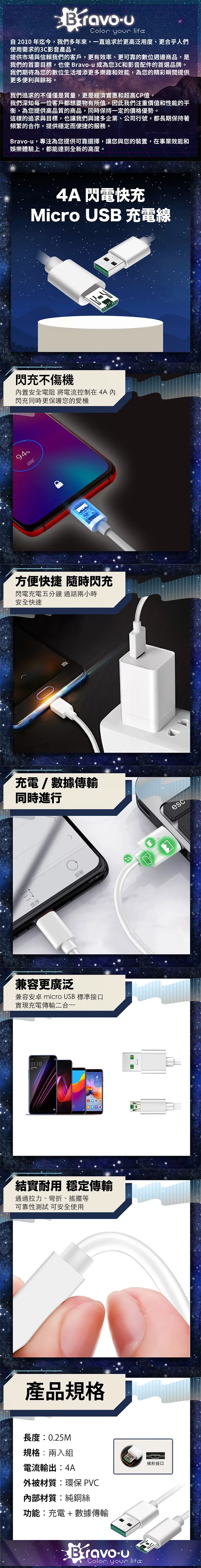 / 【Bravo-u】4A高速閃充 Micro USB 充電線 支援QC快充 0.25M 白 兩入組