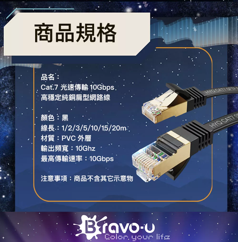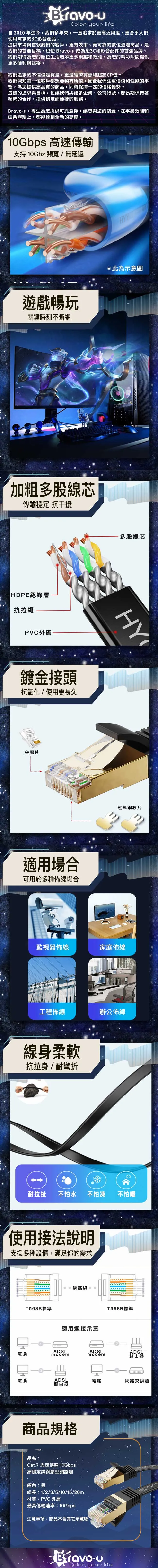 【Bravo-u】Cat.7 光速傳輸10Gbps高穩定純銅扁型網路線 黑 10M