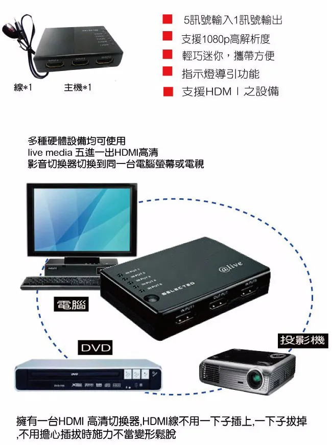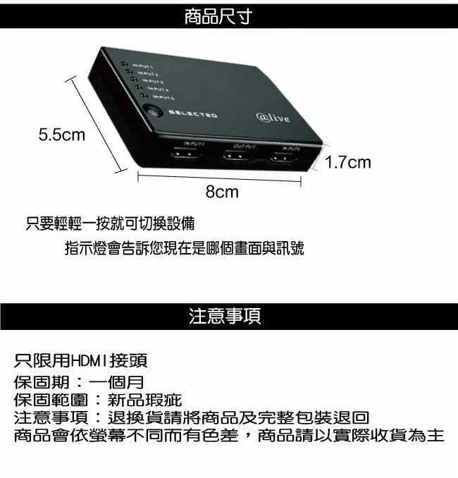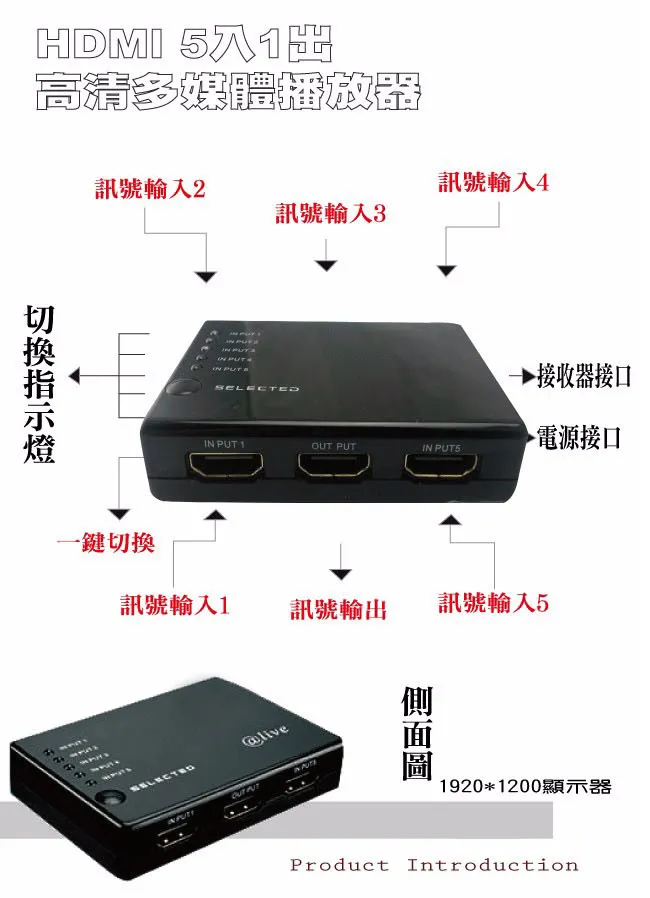 【Bravo-u】HDMI 五入一出 高清多媒體切換器(黑)