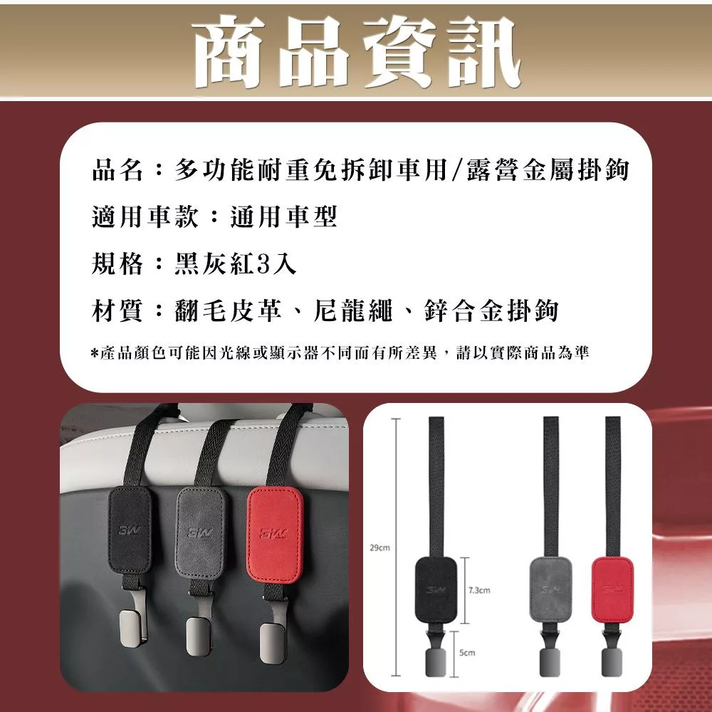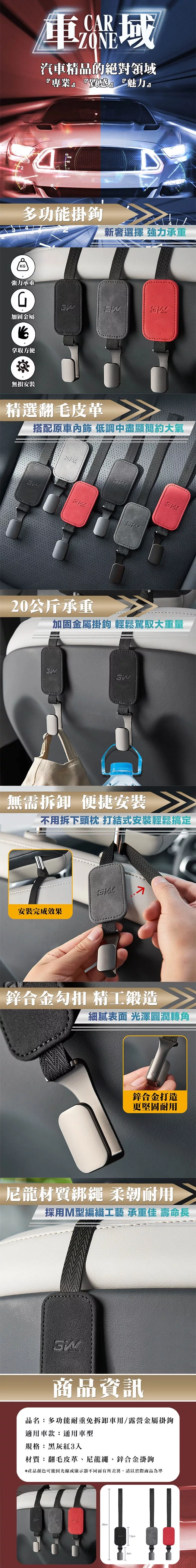 【CarZone車域】多功能耐重免拆卸車用/露營金屬掛鉤(黑灰紅3入組)