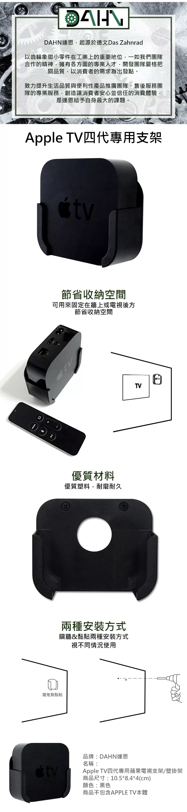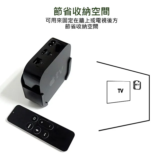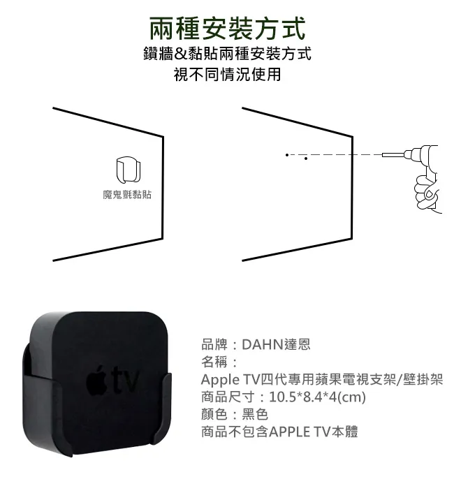 APPLE TV 4專用完美貼合,可當保護殼使用 魔鬼氈安裝簡單,牆面不鑽孔 可選擇螺絲鑽牆更穩固
