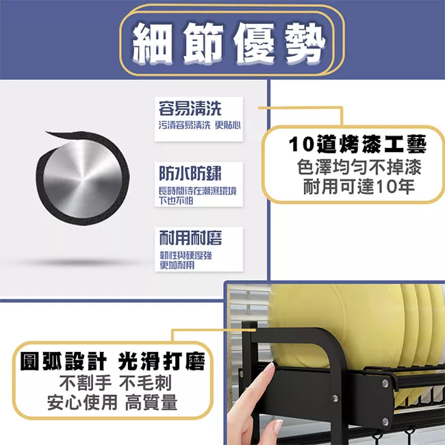 雙杆支架,支撐強度加倍 瀝水孔設計,通風透氣不積水 卡式碗位,大小盤都可輕鬆放置