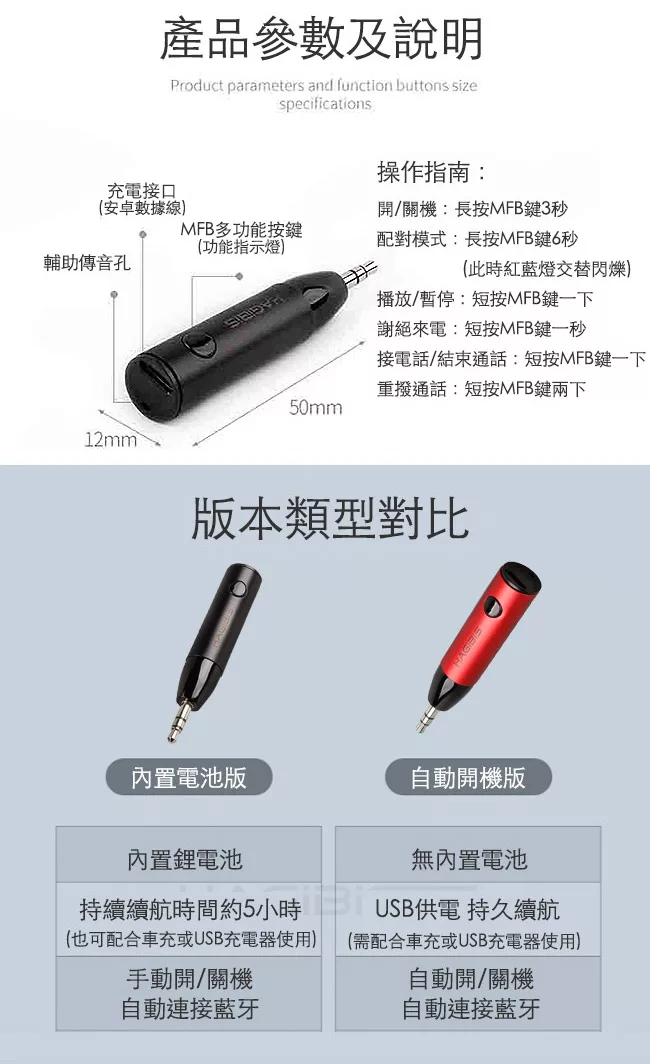 【HAGiBiS 海備思】AUX/3.5mm 4.1版免持通話音源接收器(電池款)