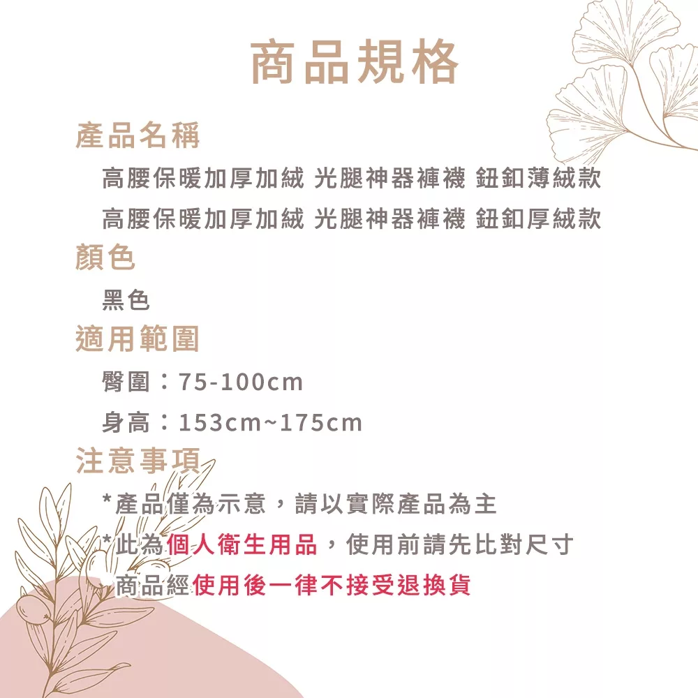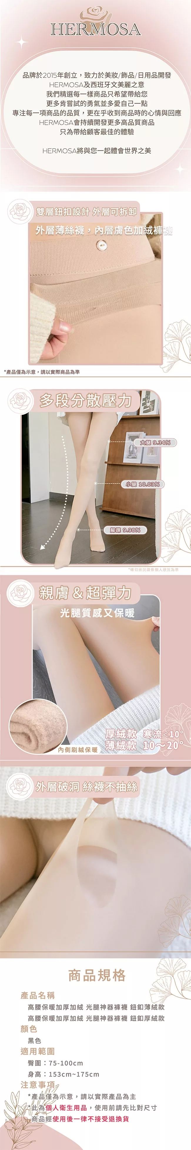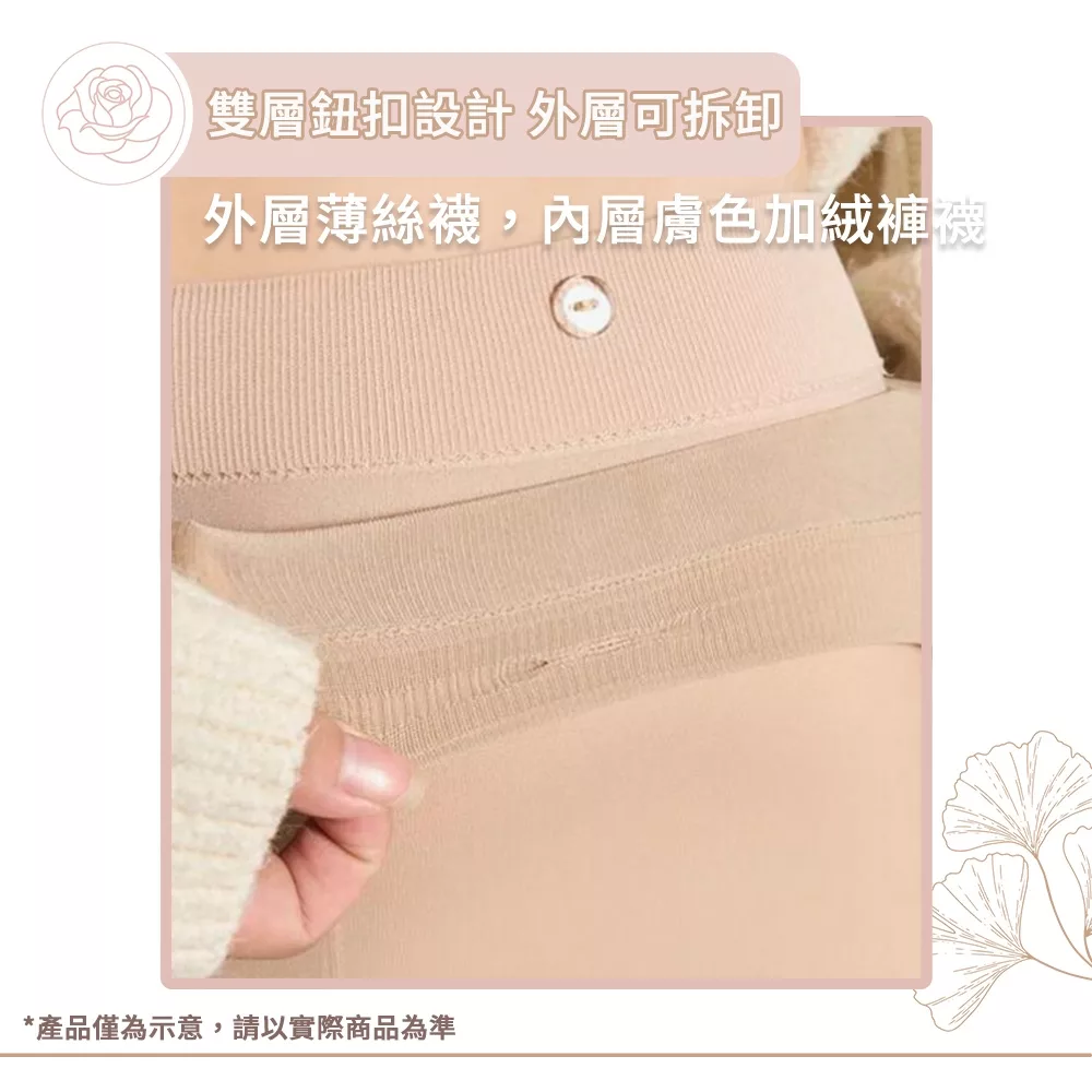 雙層鈕扣設計,外層可拆卸 多段分散壓力,微壓顯瘦 親膚,超大彈力 內側刷絨保暖 外層破洞,絲襪不抽絲