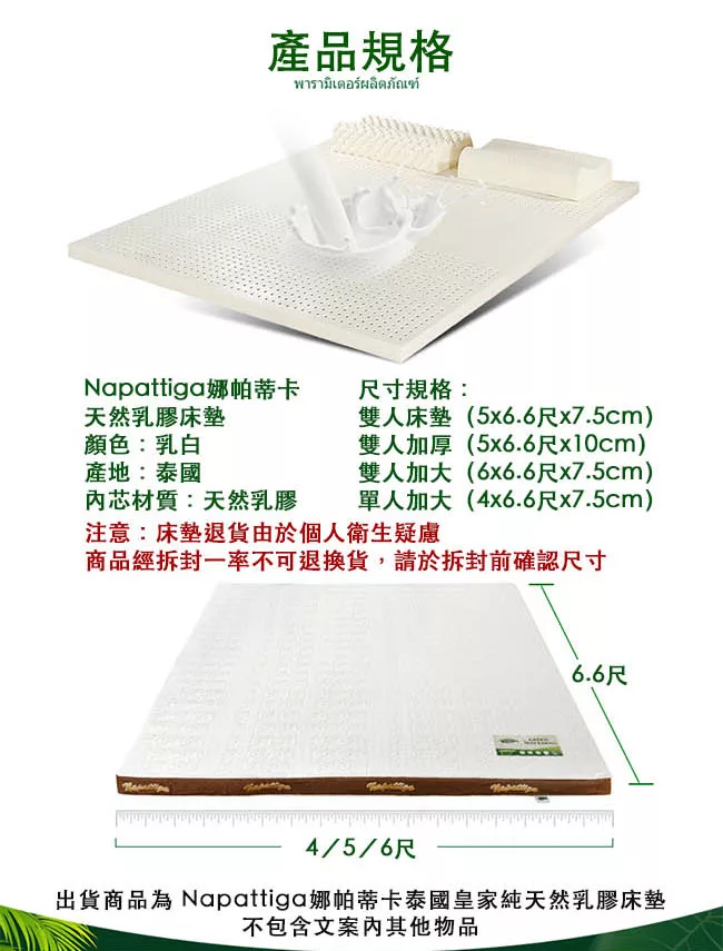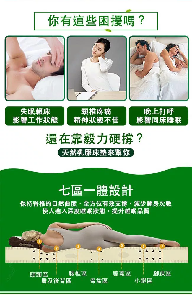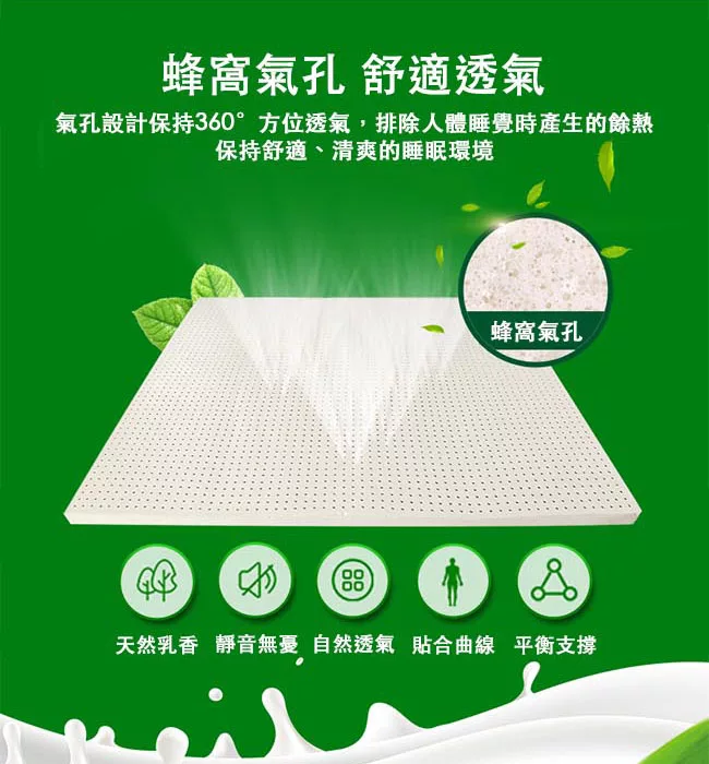 ◆ 天然乳膠製成,99%抗菌,68%防塵螨 ◆ 通過ISO、ISPA、德國LGA等檢驗,品質更有保障 ◆ 蜂窩狀結構有良好透氣性,時刻保持涼爽舒適 ◆ 乳膠軟體分子結構,提升睡眠品質 ◆ 七區一體設計,高密度護脊 ◆ 商品內有附卡,可查詢真偽 ◆ 床墊退貨由於個人衛生疑慮,商品經拆封一率不可退換貨,請於拆封前確認尺寸