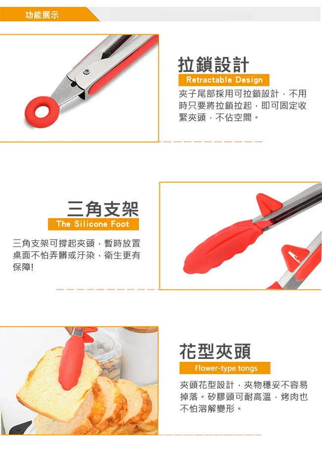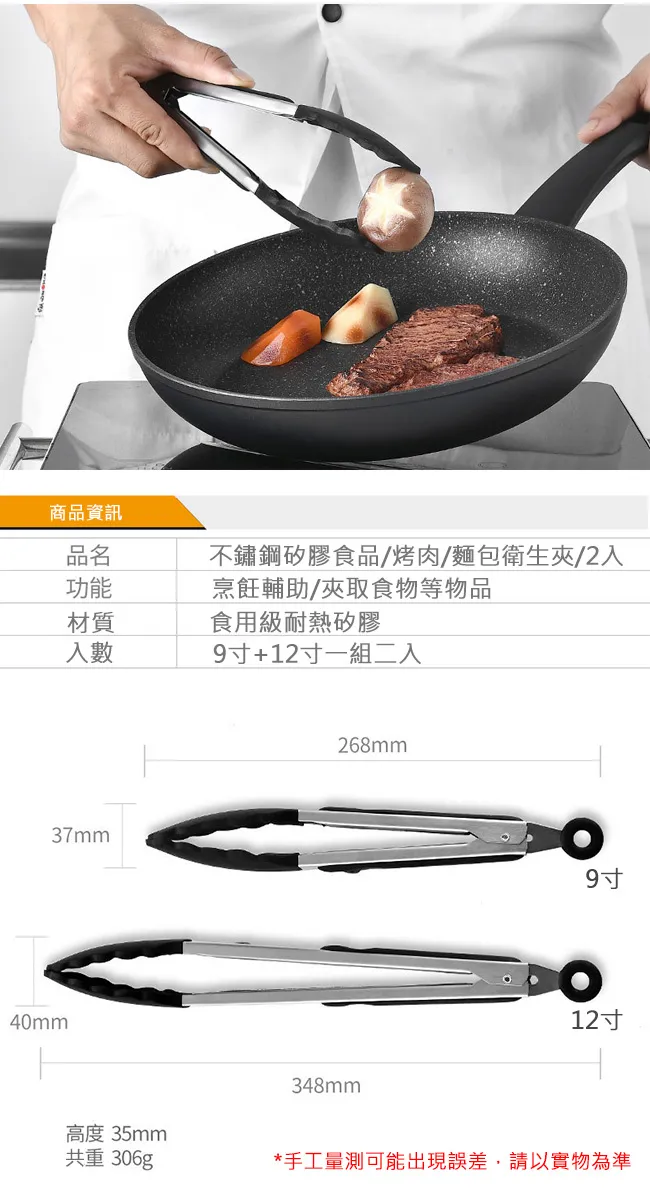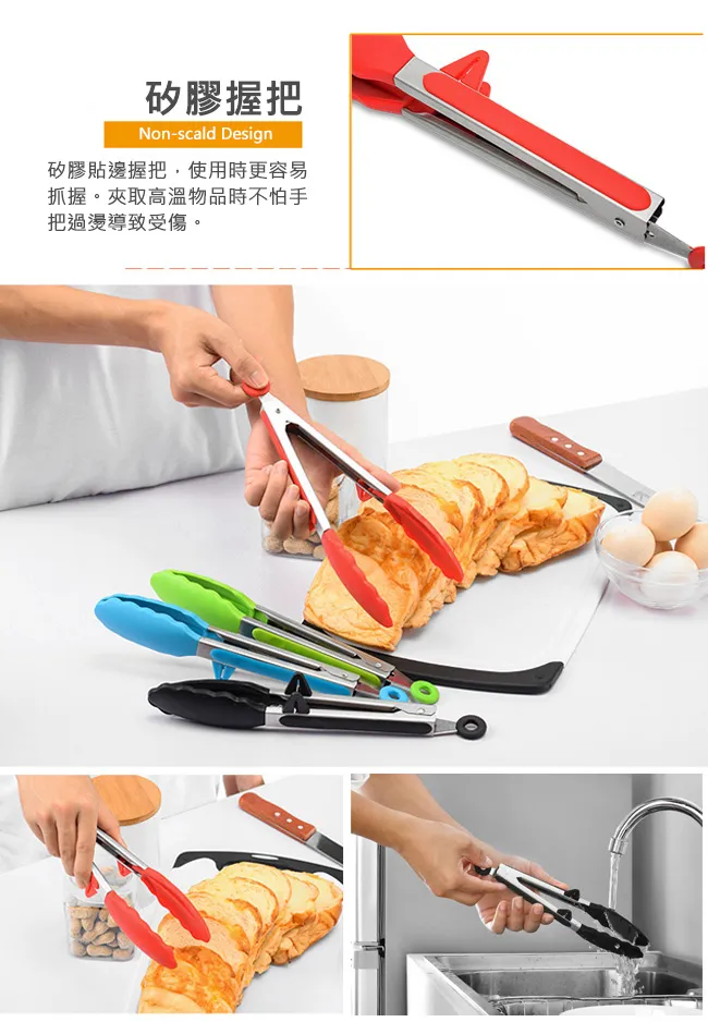 【Time Leisure 品閒】不鏽鋼矽膠食品夾/烤肉/麵包/衛生 帶三角支架 2入