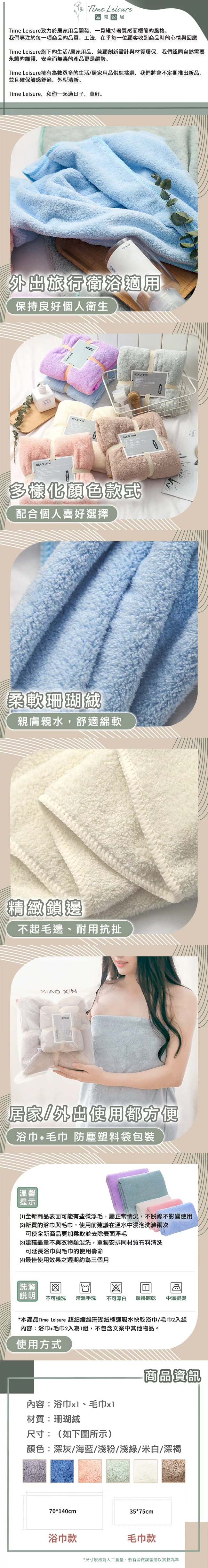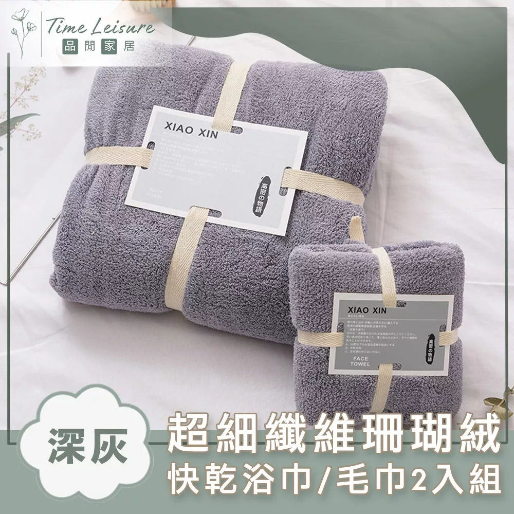 【Time Leisure 品閒】超細纖維珊瑚絨極速吸水快乾浴巾/毛巾2入組
