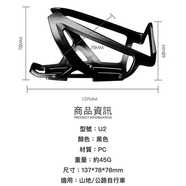 安裝穩固,拿取方便 貼合車架,經久耐用 寬位螺絲位設計,適用多種車型 一體成型,材料厚實,韌性耐用 凌動線條,U型凹槽形狀