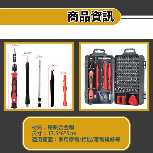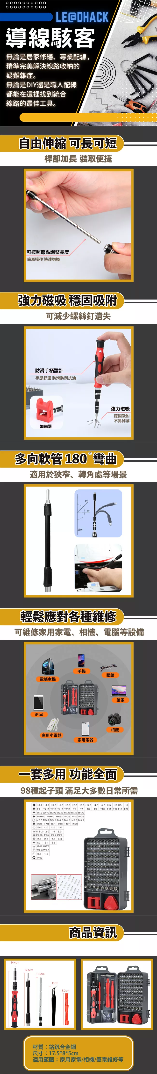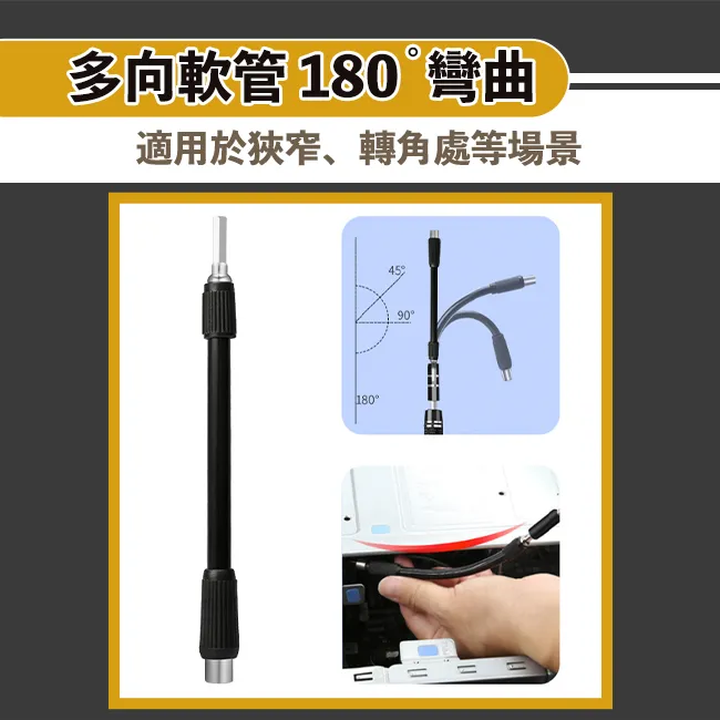 98種起子頭,滿足日常所需 軟管可180度彎曲適用於狹窄處 可用於維修家用家電/相機/電腦