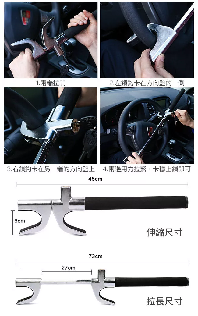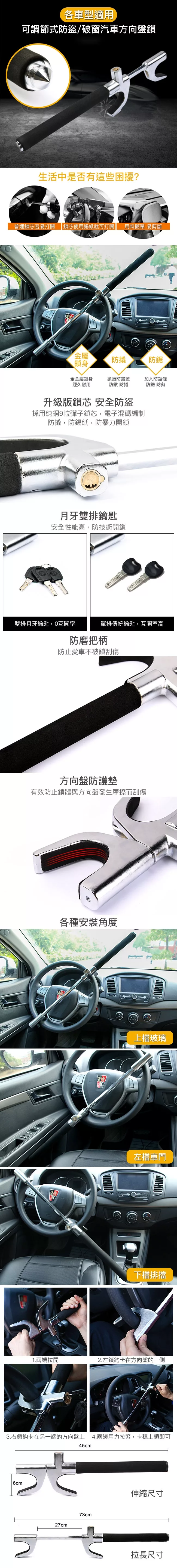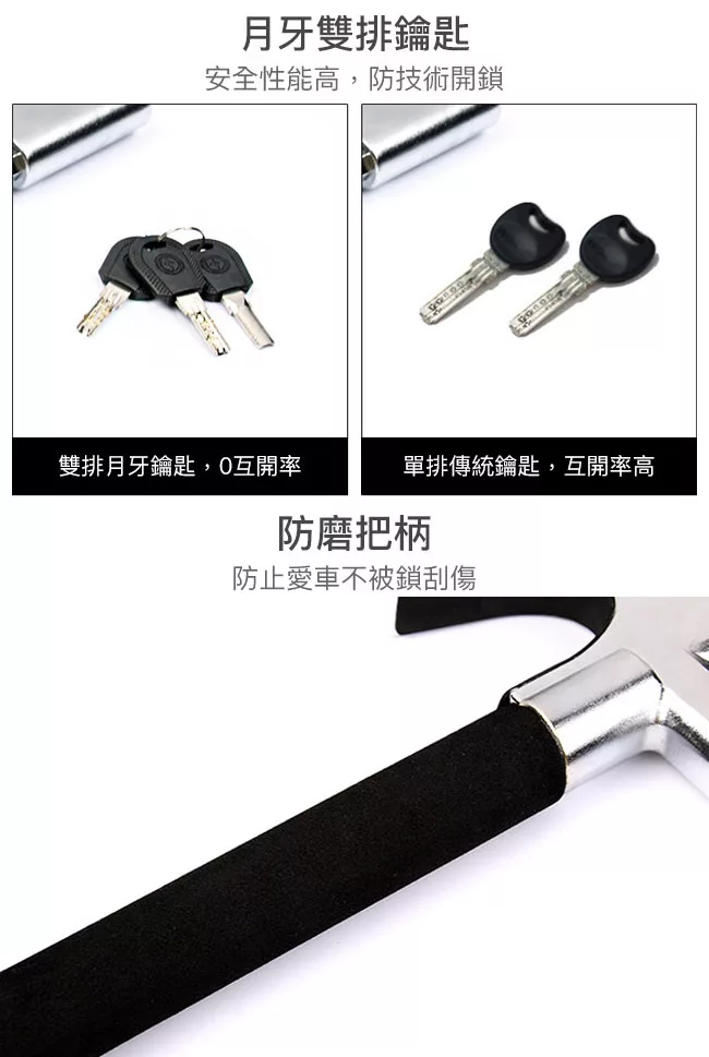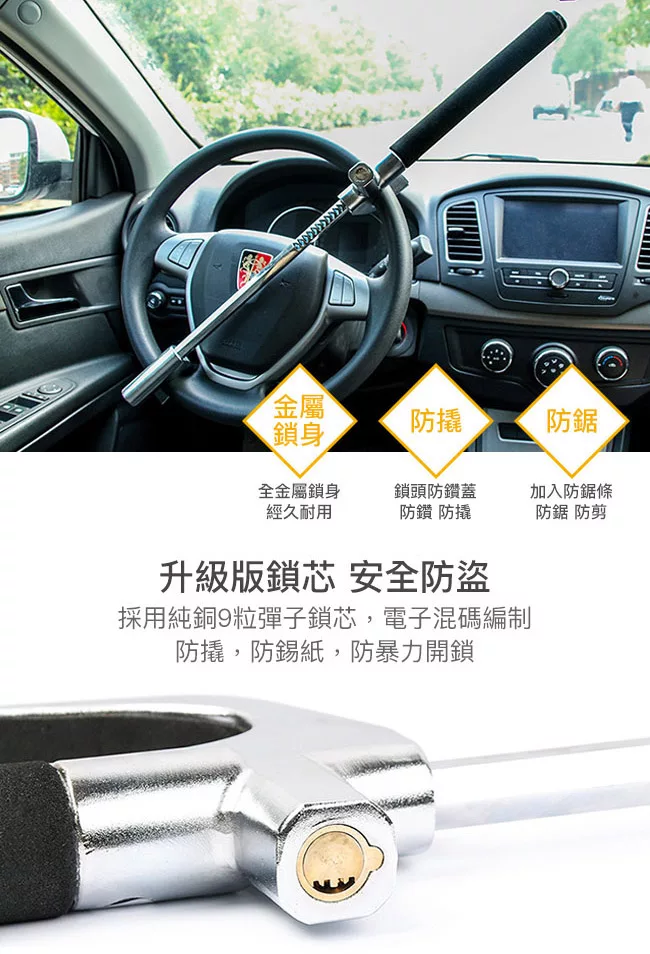 全金屬鎖身,耐用更持久 鎖頭新增防鑽蓋,防暴力開鎖 升級防鋸條,安全更防盜 月牙雙排鑰匙防技術開鎖安全性高 方向盤保護墊,減少摩擦防刮傷