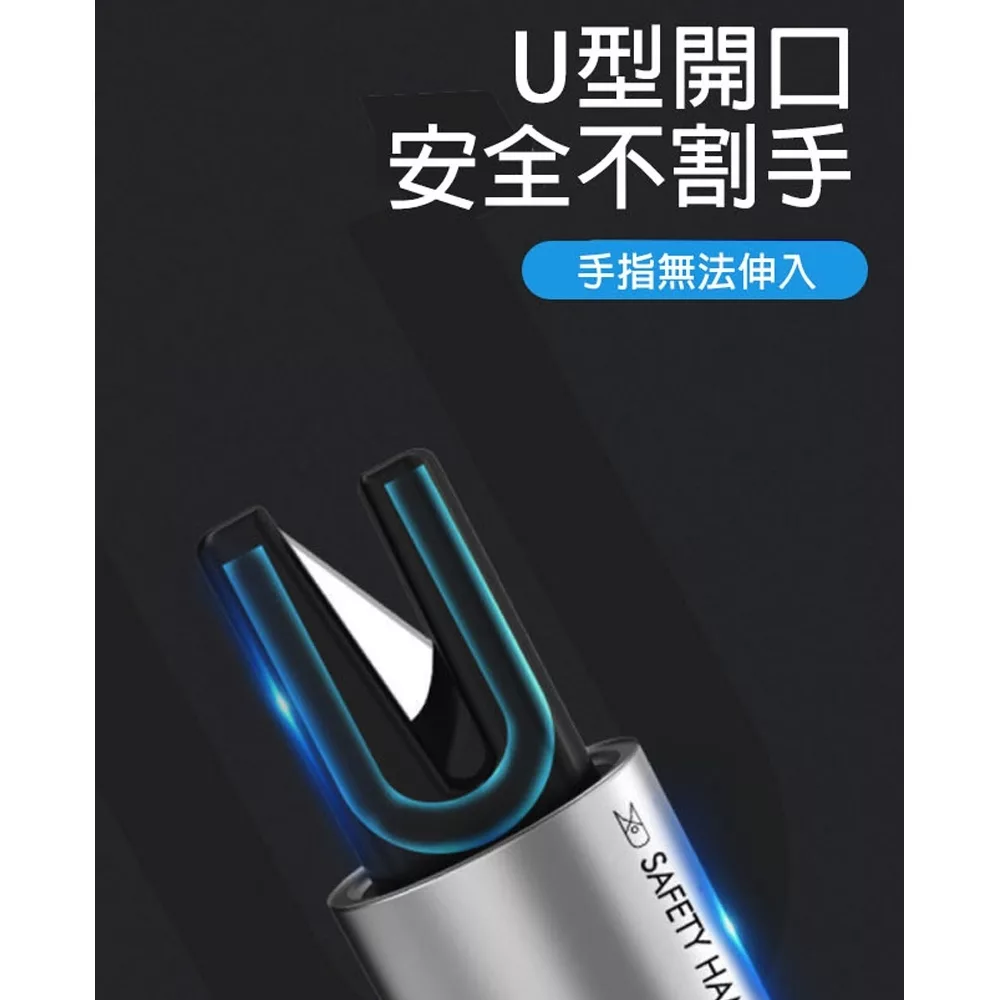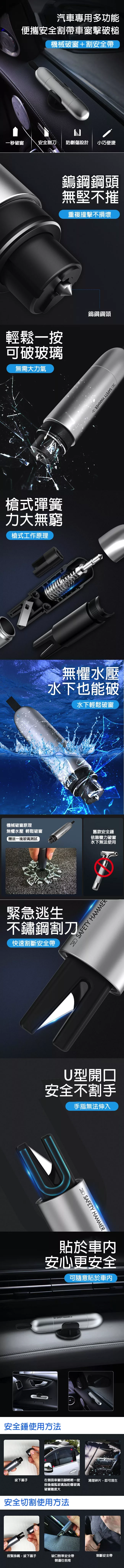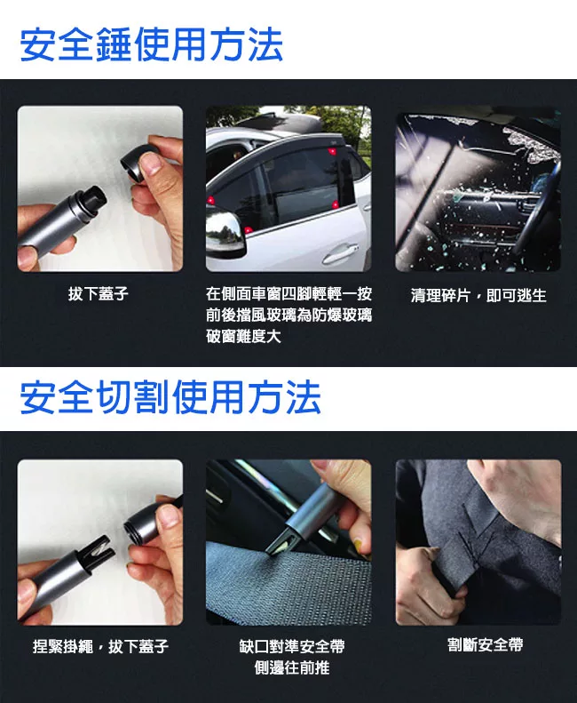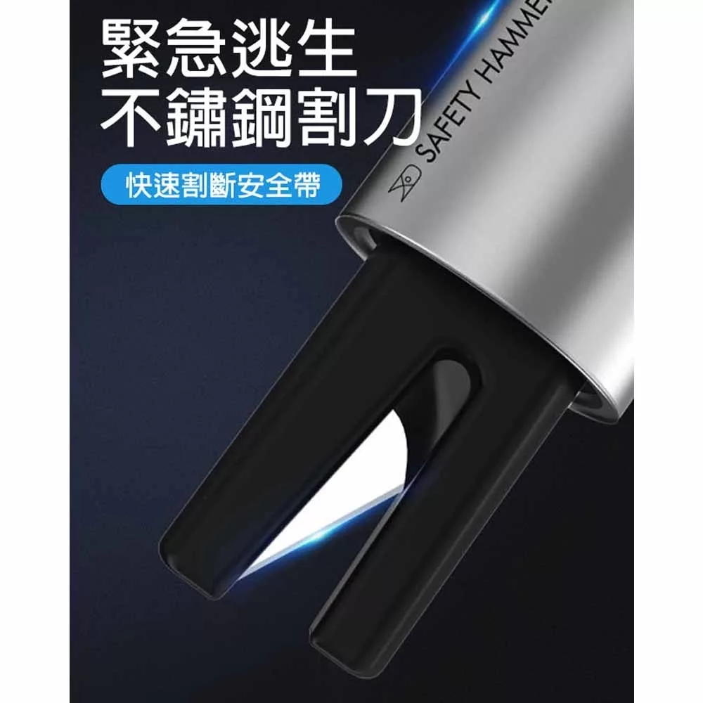 鎢鋼鋼頭,重複撞擊不損壞 無需大力氣,輕鬆一按即可破窗 無懼水壓,水下也能輕鬆破窗 不鏽鋼割刀,快速割斷安全帶 U型開口,安全不割手